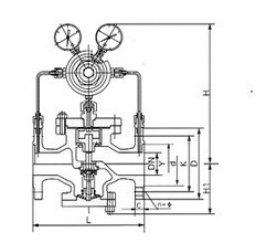 YK43X氣體減壓閥屬于先導活塞式減壓閥.由主閥和導閥兩部分組成.主閥主要由閥座、主閥盤、活塞、缸套、彈簧等零件組成。導閥主要由閥座、閥瓣、膜片、彈簧、調節彈簧等零件組成。通過調節調節彈簧壓力設定出口壓力,利用膜片傳感出口壓力變化,通過導閥啟閉驅動活塞調節主閥節流部位過流面積的大小,實現減壓穩壓功能。